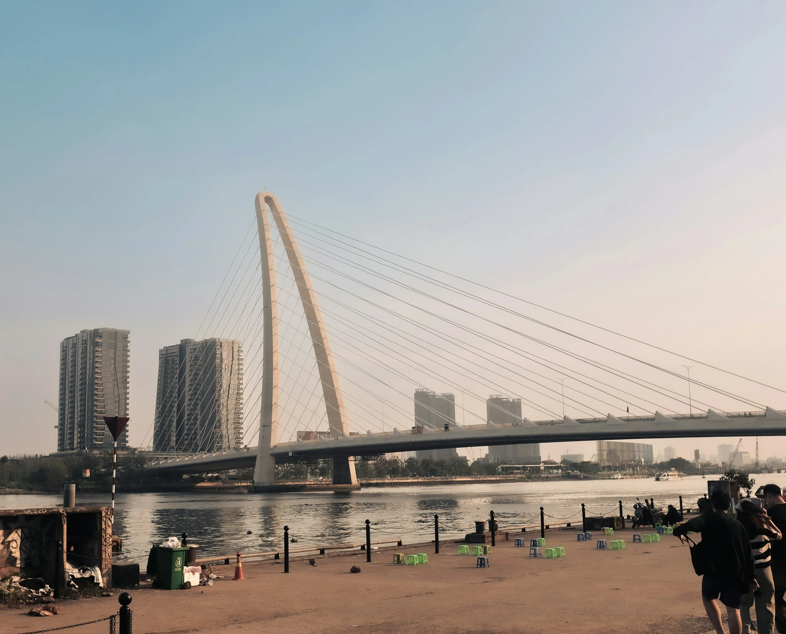 O Tabuleiro/Viga Principal: Uma viga ou treliça metálica muito mais leve e esbelta, responsável apenas por vencer vãos menores entre os pontos de fixação dos tirantes.